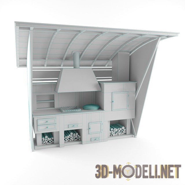 3D модель уличного барбекю, мангала Бабино. Традиционный кирпич и чугунные решетки, дверцы и заслонки, дрова в нижней части печи и черная грубая вытяжка неожиданно хорошо сочетаются с современными материалами, из которых сделаны боковина и крыша барбекю. Это металлическая сверкающая основа и закрепленные на ней листы глянцевого гибкого пластика малинового цвета.