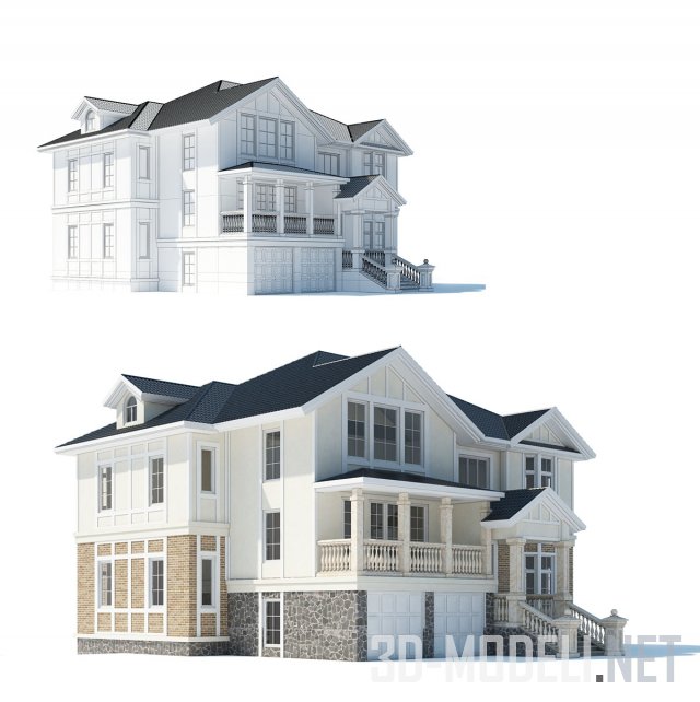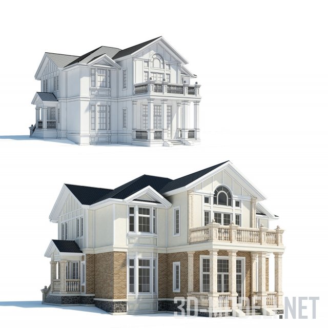 Двухэтажный дом в классическом стиле, с присущими архитектуре элементами. Первый этаж отделан кирпичом, что элегантно гармонирует с белым цветом второго этажа дома. Балясины на перилах, арочная форма и французские окна формируют легкий и красивый фасад.