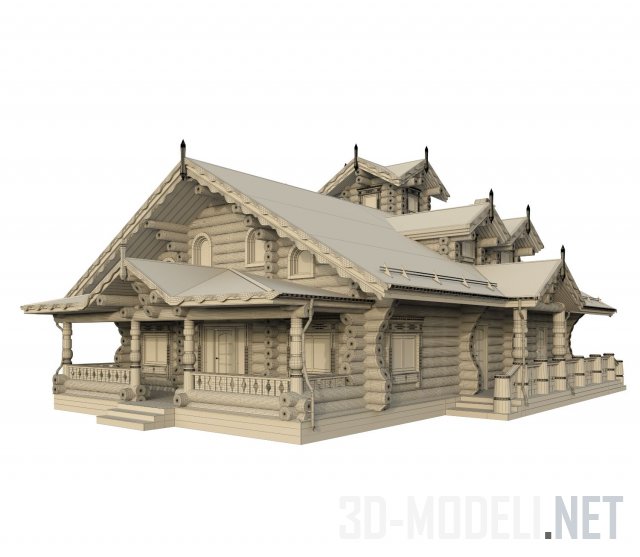 Сказочно-красивый терем из толстых бревен, со сложной двухскатной кровлей под коричнево-красной битумной черепицей, «кукушками», резными колоннами на крыльце, арочными окошками и каменным цоколем. Торцы бревен выкрашены коричневым.