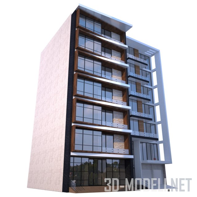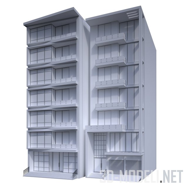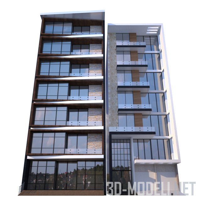Два высоких семиэтажных дома с большими стеклянными окнами, длинными балконами и кирпичными вставками. В одном доме на первом этаже просматривается магазин со стеклянными фасадами, в другом - вход в подъезд.