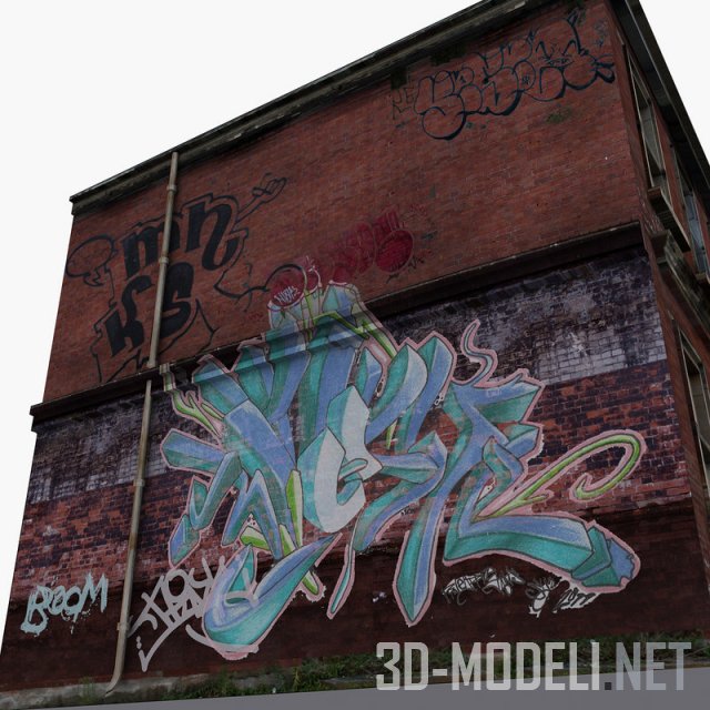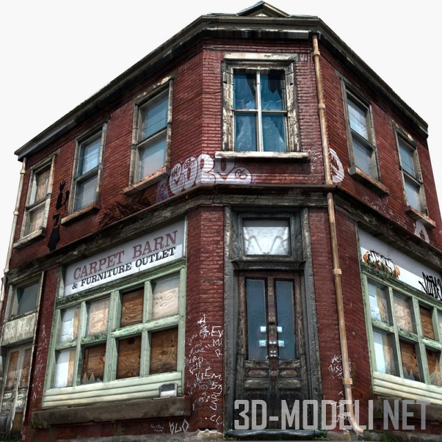 Двухэтажный заброшенный дом из красного кирпича. Классическая европейская архитектура с витринами на первом этаже и жилыми помещениями на втором. Фасад испещрен граффити. Оконные и дверные проемы забиты старой фанерой.