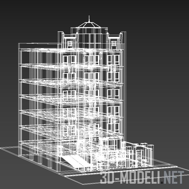 Семиэтажное здание в классическом стиле. В традиционные элементы гармонично интегрирована современная фасадная подсветка. Входная группа включает ворота и пару дверей.