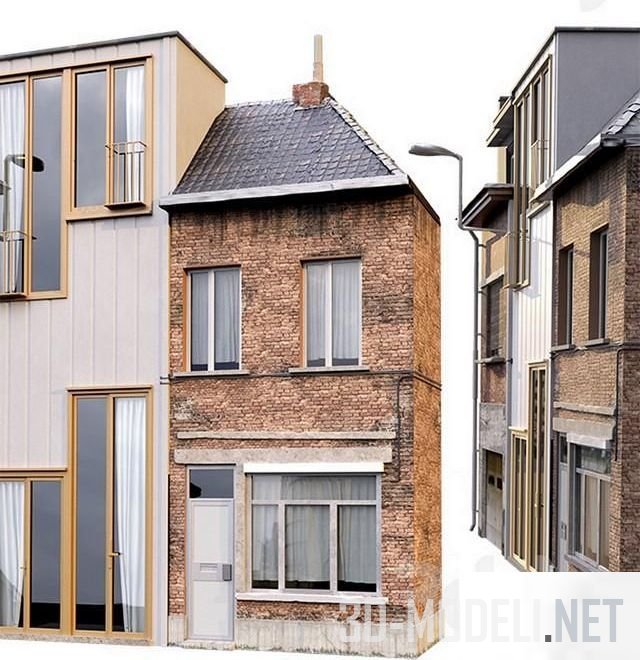 Фасады трех домов. Дома, которые можно встретить на тесных городских улицах старых городов. Первый и третий выполнены из старого красного кирпича. Фасад второго дома современный, отделан широкими вертикальными панелями белого цвета.