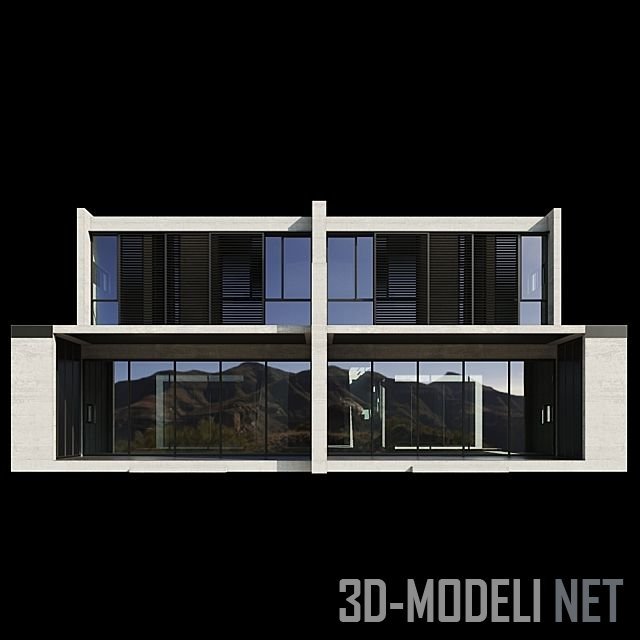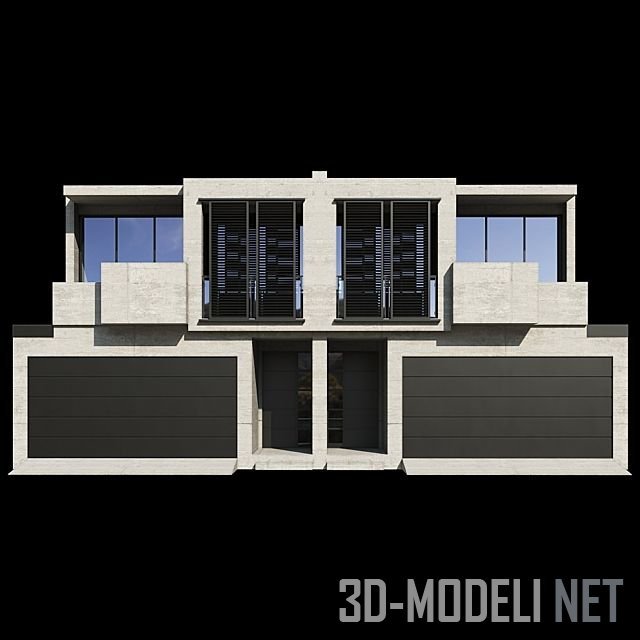 Современный двухэтажный дом на двух хозяев. С плоской кровлей, встроенными гаражами на первом этаже, террасами и зонами отдыха. Строение создано из двух отзеркаленных блоков в стиле минимализм. Фасады отделаны светлым травертином. Рамы окон, ворота гаражей, водостоки - темные. Некоторая часть оконных проемов дополнительно декорирована горизонтальными жалюзи.