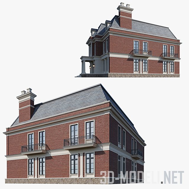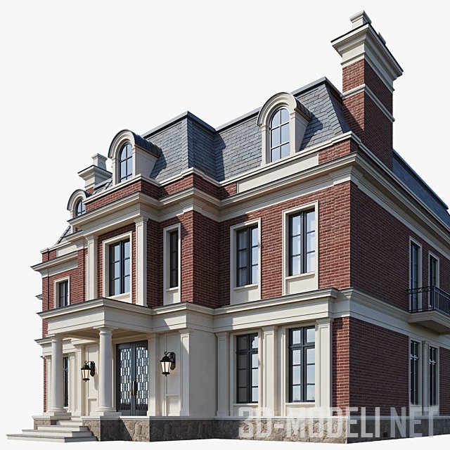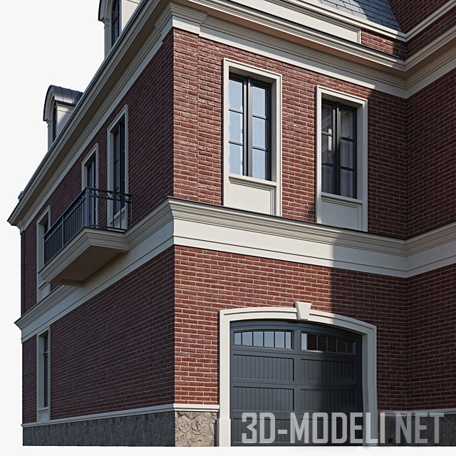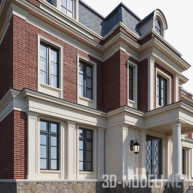 Кирпичный дом в классическом стиле, в два этажа, с гаражом и мансардным этажом. Парадное крыльцо декорировано колоннами, пилястрами, настенными коваными светильниками. Окна мансардного этажа арочные. Темно-красный кирпич на стенах скомбинирован с бутовым камнем на цоколе и серой битумной черепицей на кровле.