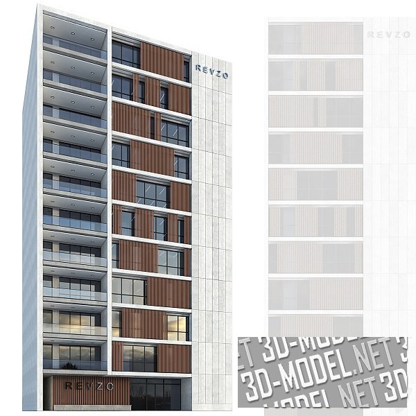 Современное многоэтажное офисное здание. Лаконичная конфигурация серой одиннадцатиэтажки разбавлена ассиметричными коричневыми панелями, частично закрывающими часть остекления фасада. В правом верхнем углу фронтальной части здания - объемная надпись «REVZO».