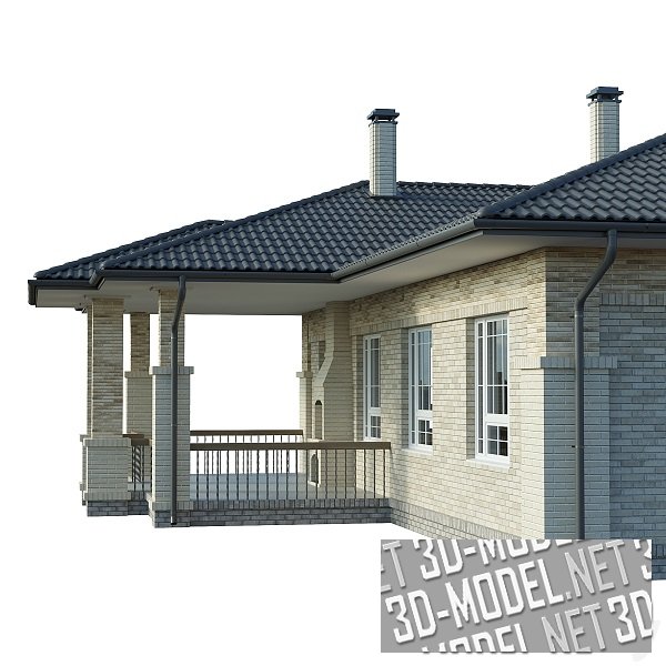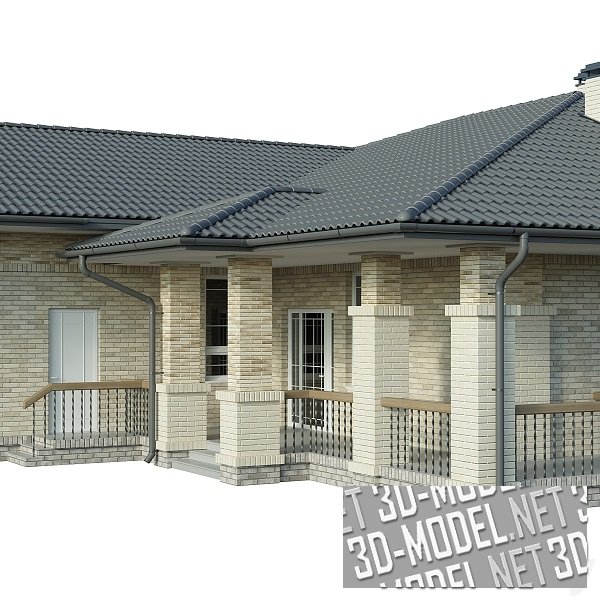 Одноэтажный загородный кирпичный дом в стиле кантри с гаражом и небольшой террасой с печью. Отделка дома выполнена из нескольких видов кирпича: цоколь - из серого; нижние ряды кладки стен и дымоходы - из однотонного кирпича цвета слоновой кости; верхние ряды кладки - смесь (баварская кладка) из кирпича песочных оттенков. Кровля укрыта черепицей графитово-серого цвета. Оконные и дверные рамы - белые, с тонкими шпросами. Водосточные трубы и желоба - темно-серые. Ограждения крыльца и террасы - металлическое, с массивными деревянными перилами.