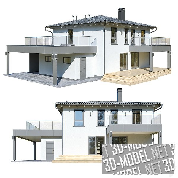Современный загородный двухэтажный дом в Германии, с большими балконами второго этажа и парковочным местом под одним из них. В отделке дома использованы серебристо-серые композитные панели, белая штукатурка. Напольные покрытия крыльца - серая и бежевая плитка. На колоннах и фасадах смонтированы светильники, создающие ночью красивую локальную подсветку. Четырехскатная кровля с небольшим уклоном накрыта серой черепицей. Оконные и дверные рамы с прозрачным остеклением, цоколь, дымоходы, вент-трубы и водосточные системы - серые.