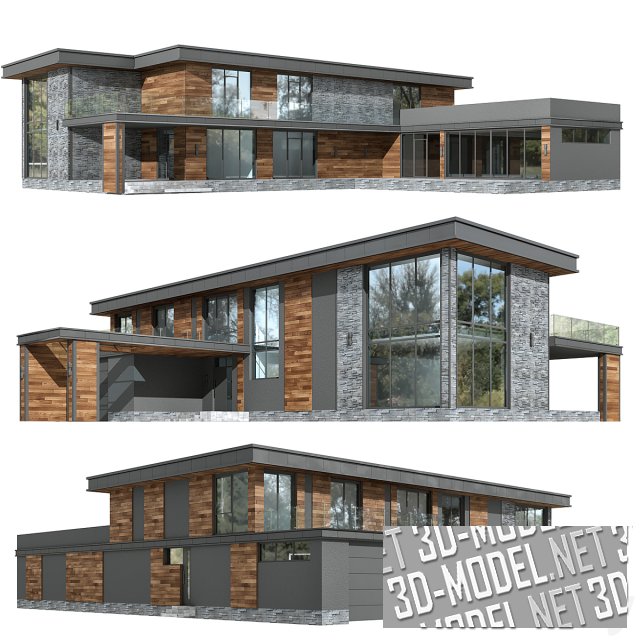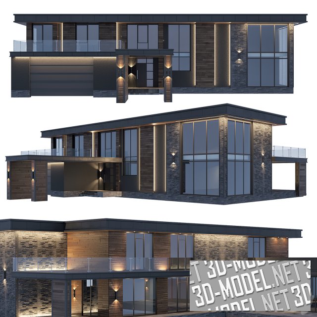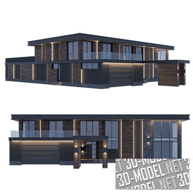 Двухэтажный современный загородный дом в стиле Райта, с бассейном внутри, гаражом и широкими террасными балконами на втором этаже. Плоская кровля, обильное остекление, графитовые элементы отделки фасада гармонично соседствуют с деревянными планками и узким горизонтально уложенным рельефным камнем. Фасадные светильники и скрытые линейные подсветки подчеркивают строгие линии здания и рельефы отделочных материалов. Габарит здания: 24х26м. Здание представлено в двух вариантах: с подсветкой и без.