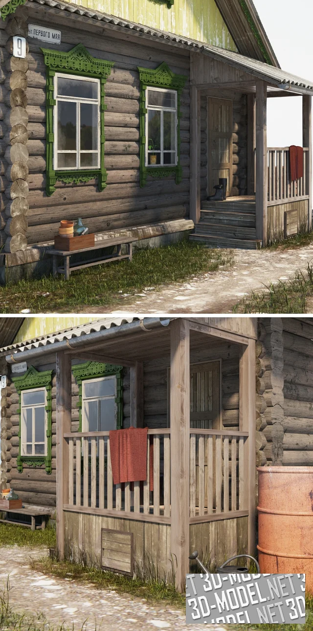 Старый бревенчатый деревенский дом с небольшим крыльцом и двухскатной черепичной кровлей. Резные наличники вокруг окон и наличник на кровле выкрашены в травянистый цвет. Фронтон с чердачным окном отделан вертикальной вагонкой светло-салатового цвета.