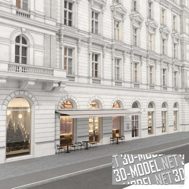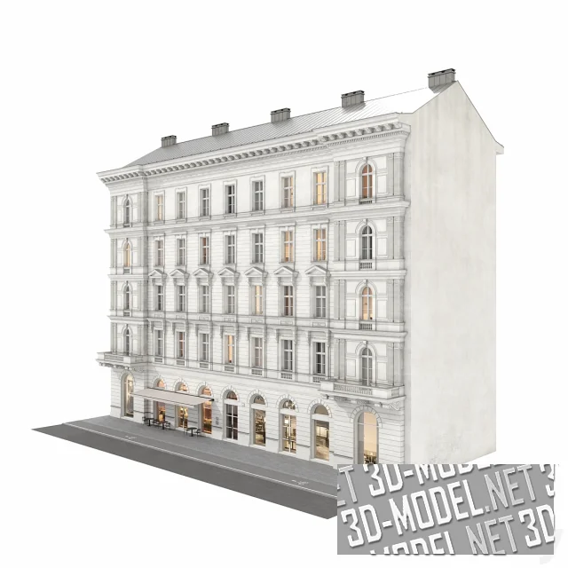 Дом в Вене, выполнен в классическом стиле европейских городов. Здание имеет симметричный фасад с фронтонами над окнами и другими архитектурными элементами, характерными для архитектуры Вены 19 века. На первом этаже расположено кафе с большими арочными окнами.