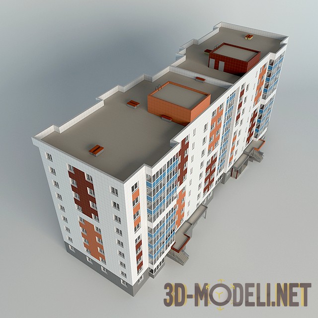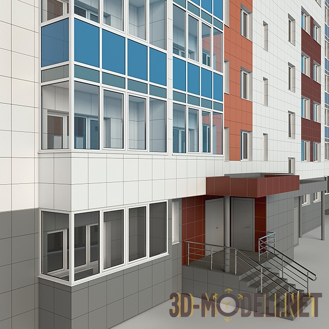 Это детальная 3D-модель современного, многоквартирного, 9-ти этажного жилого дома. Материалы на модели настроены, все текстуры имеются.