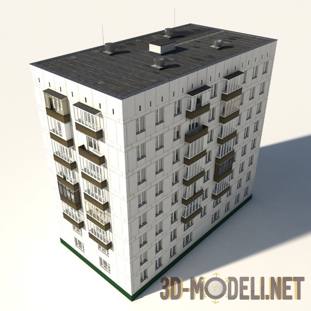 3D-модель 9-ти этажного, многоквартирного дома. Это распространенное строение в Москве и других городах из серии II-18 (хрущевка), строились такие дома с 60-х годов прошлого века. Модель сделана в соответствии с оригиналом и имеет неплохую детализацию (около 30000 полигонов). Все текстуры есть, материалы настроены.