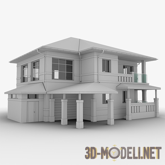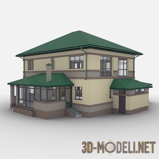 3D модель двухэтажного дома с верандой, балконами и зеленой крышей. Формат: 3ds Max 2011 и obj. Текстуры для модели собраны в архиве, материалы Vray.
