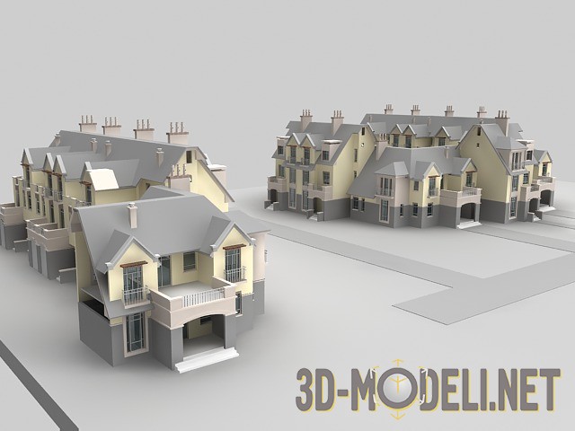 3D-модель коттеджного комплекса - часть элитной застройки из многоэтажных коттеджей. Подобную 3d-сцену вполне можно использовать как основу для создания качественных архитектурных визуализаций.