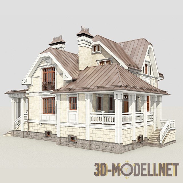 Красивый классический коттедж из Барвихи с богатой отделкой и множеством декоративных архитектурных элементов. Объект имеет высокую детализацию (более миллиона полигонов в сцене), настроенные шейдеры и текстуры в комплекте. Прекрасно подойдет для реалистичных архитектурных рендеров, для размещения на крупных планах.