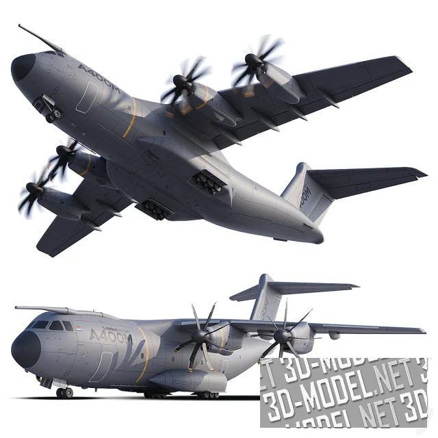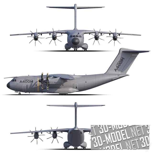 Массивный военно-транспортный самолет Airbus A400M показан во всем своем характере: мощное высокорасположенное крыло, четыре восьмилопастных турбовинтовых двигателя, развитое оперение и грузовой фюзеляж с характерным «горбом» в корневой части крыла. Детально проработаны створки шасси, грузовые люки, панели обшивки с расшивкой, антенны, обтекатели и характерный камуфляж с маркировкой A400M. Отдельного внимания заслуживают винты с узнаваемой формой лопастей и желтыми кончиками – именно они создают ощущение масштабности и мощи при любых ракурсах.