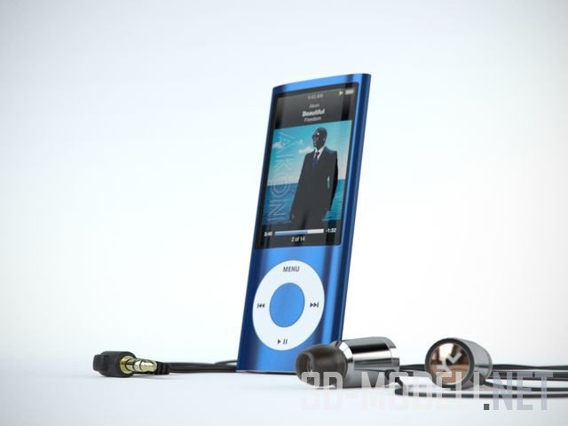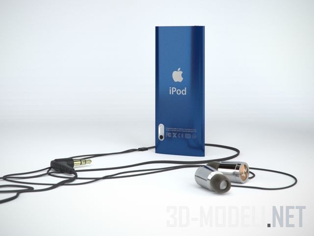 Небольшие современные наушники Fischer Audio Silver Bullet с хромированными корпусами и чёрными резинками и плеер iPod nano 5 в синем корпусе. Комплект с текстурами и материалами.