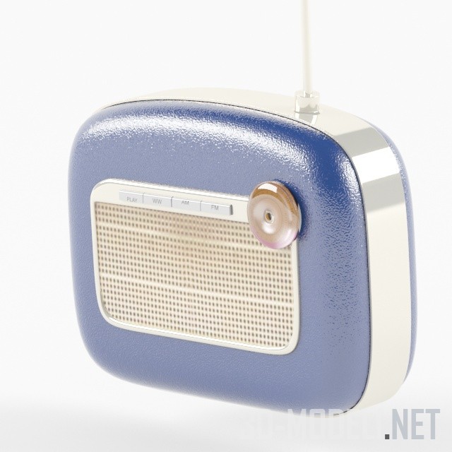 Маленький переносной радиоприемник в ретро–стиле. Приемник представлен в корпусе василькового цвета с закругленными гранями, характерными для средины ХХ века. На передней плоскости разместилась белая решетка динамика, кнопки управления и ручка настройки. Телескопическая выдвижная антенна из хромированного металла.