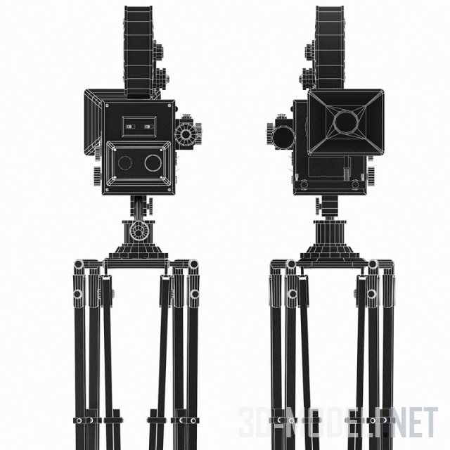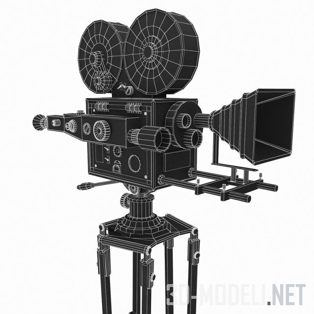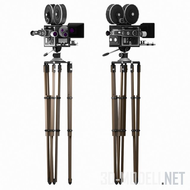 Старинная пленочная кинокамера на деревянном штативе, с поворотной головкой, тремя объективами, блендой на одном из них. Смонтированные под рабочим объективом рельсы позволяют плавно перемещать раструб бленды вдоль оси объектива. Металлический корпус камеры, бленда и коробки с кинопленкой в верхней ее части покрыты черно-коричневой краской с молотковым эффектом. Это гармонично сочетается с остальными серебристыми элементами.