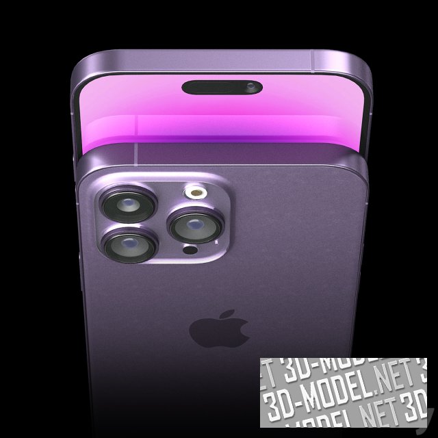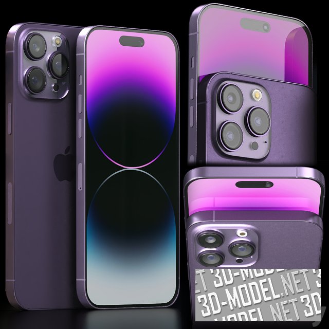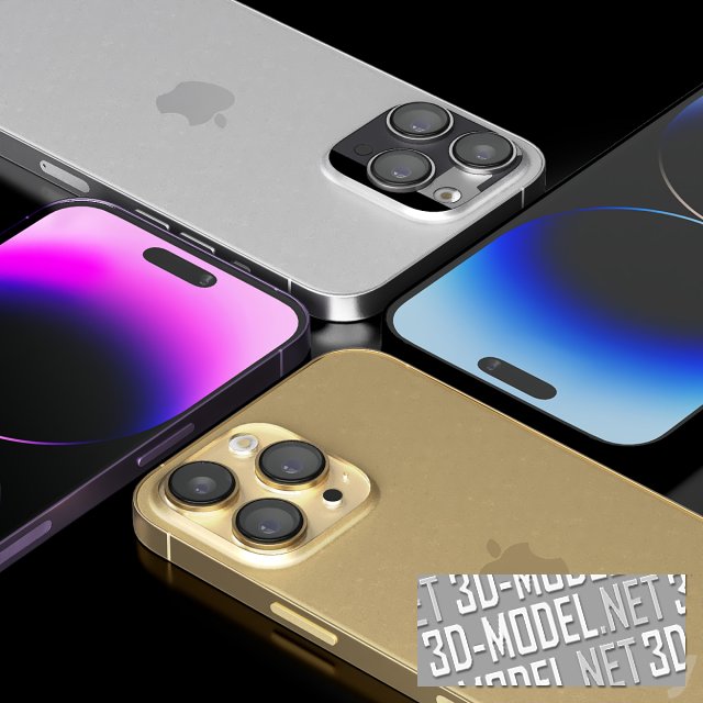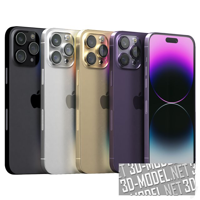 Современный смартфон iphone 14 pro max. Телефон представлен в четырех декорах: сиреневый, золотистый, серебристый, черный.