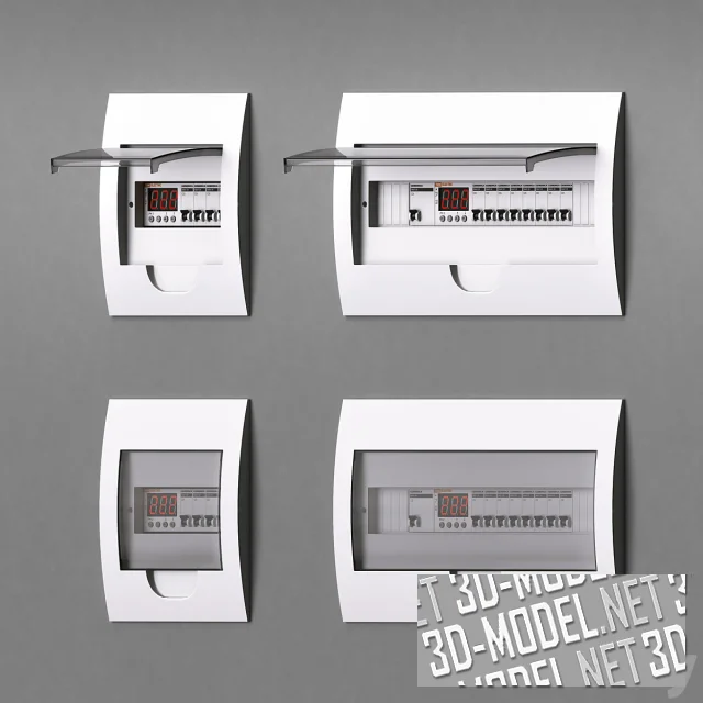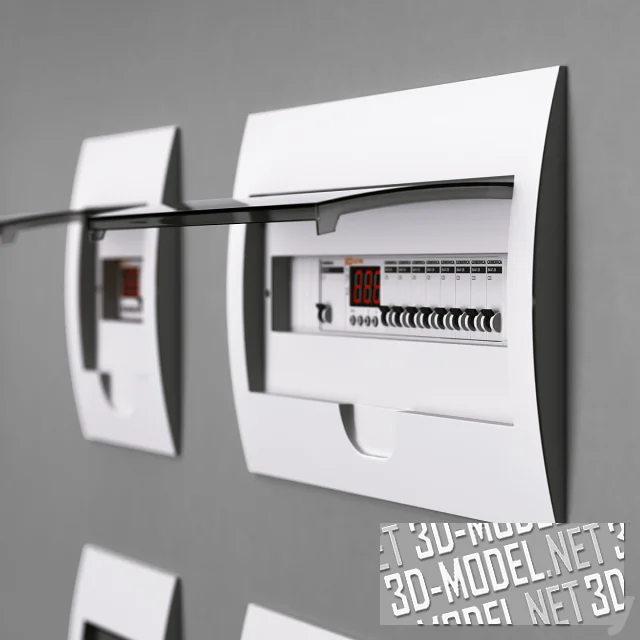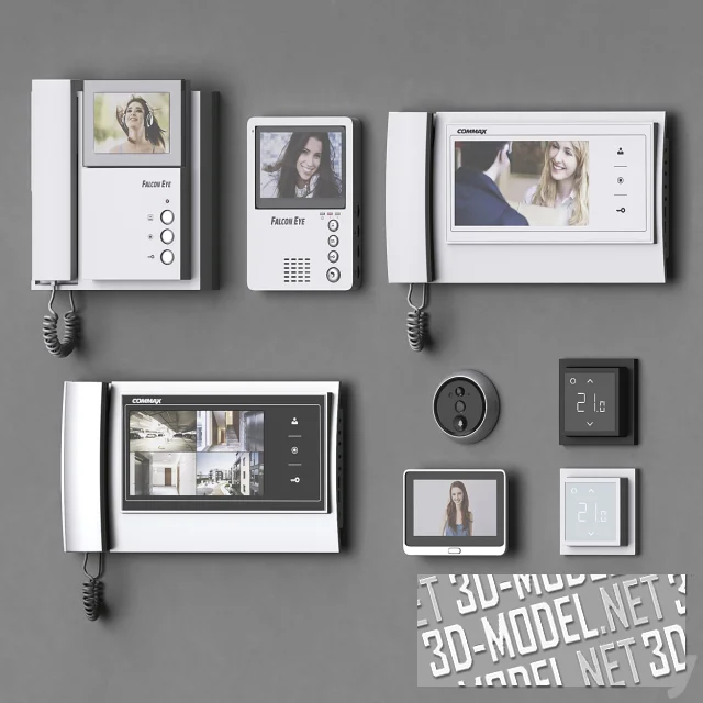 Комплект оборудования для видеонаблюдения, домофоны (наружные и внутренние блоки), термостаты и электрооборудование (щитки с автоматическими сетевыми выключателями). В наборе приборы в белых, серых и серебристых корпусах.