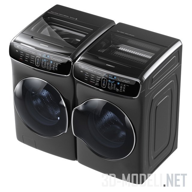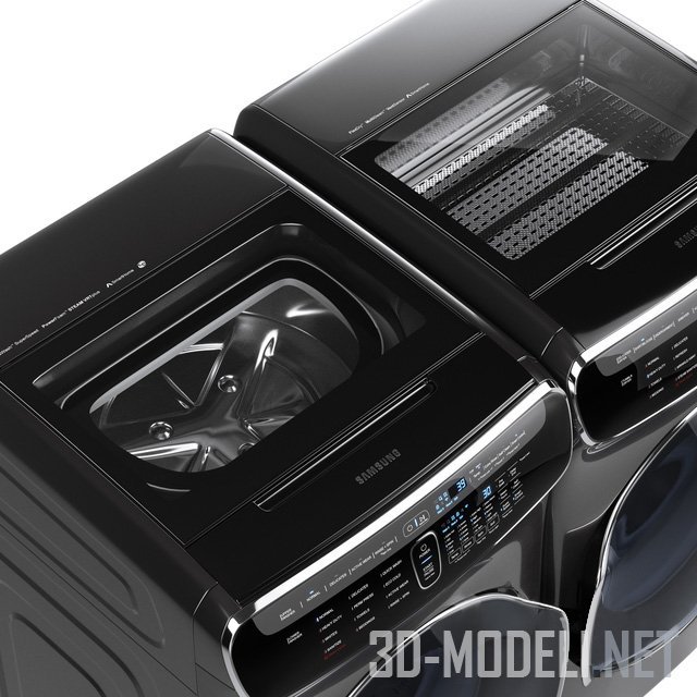 Современные бытовые агрегаты для стирки и сушки белья от Samsung. Инновационные энергоэффективные машины с двумя барабанами для небольшой загрузки сверху и объемной с фронтальной части позволяет варьировать процессы, экономя время и ресурсы. Отделка корпусов - черная, брашированная, с хромированными декоративными элементами.