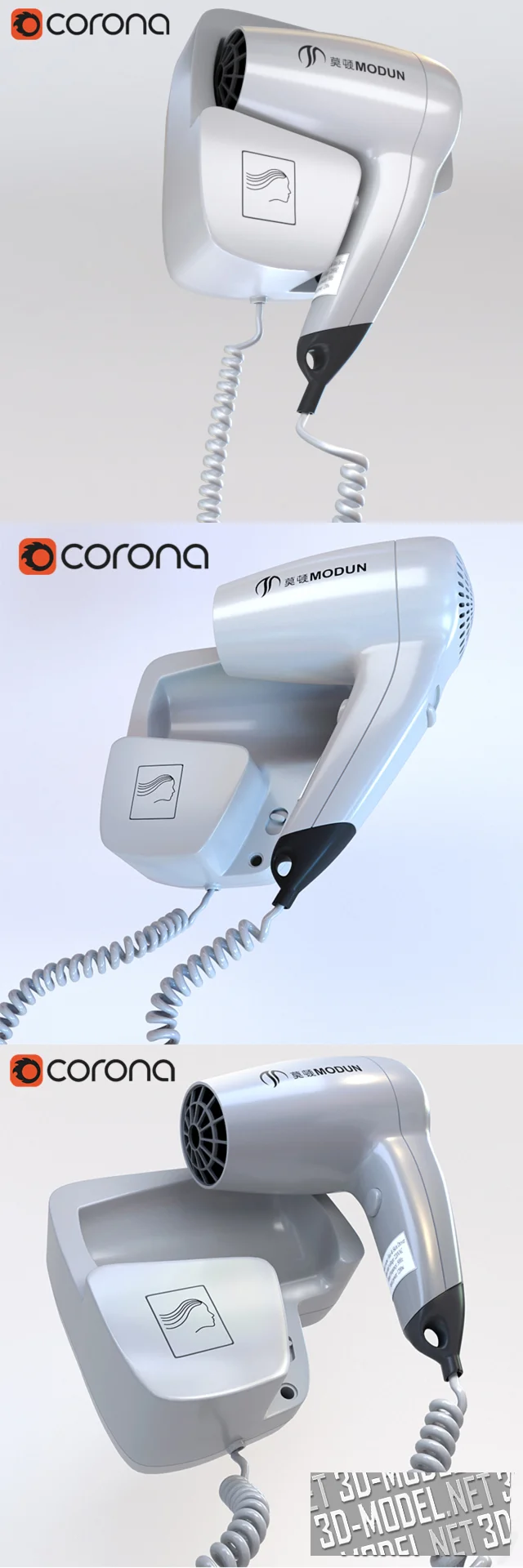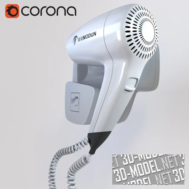 Современный настенный профессиональный фен от китайского производителя MODUN. Выполненная с вниманием к деталям высококачественная трехмерная модель поможет сделать реалистичную визуализацию салона красоты и другие интересные проекты.