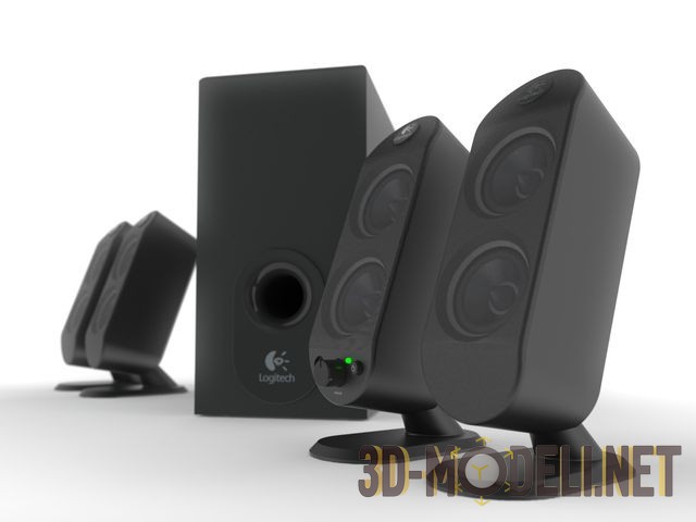 Акустическая система для компьютера, Logitech X-530. В комплекте большой сабвуфер и четыре сателлитные колонки. Комплект выполнен в чёрном цвете. Корпус сабвуфера перпендикулярной формы, на передней плоскости небольшая глянцевая панель овальной формы с круглым демпферным отверстием. Корпуса сателлитных колонок выполнены с закруглениями сверху и снизу. Колонки устанавливаются вертикально, на небольших стойках с овальной площадкой.