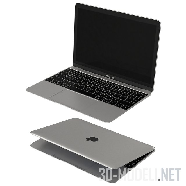 Ноутбук Apple MacBook 12 Inch с дисплеем Retina. Модель представлена в двух вариантах. В открытом с черной клавиатурой с механизмом бабочки. В закрытом - на верхней крышке серебристого цвета маленький черный логотип Apple. Можно использовать в дизайне интерьера рабочего кабинета, на письменном столе.