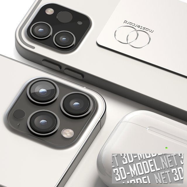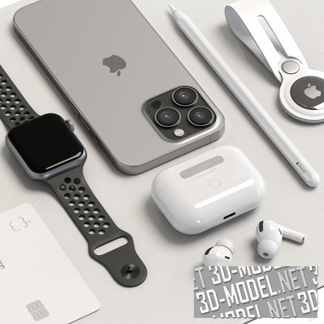 Персональные современные электронные устройства от Apple. В наборе: планшет iPad Pro; белый стилус для планшета Apple Pencil; смартфон iPhone; смарт-часы Apple Watch; беспроводные наушники AirPods; круглый брелок для поиска вещей и ключей AirTag в белом полиуретановом холдере; симкарта. Гаджеты представлены в традиционных для Apple белом и серебристом цвете.