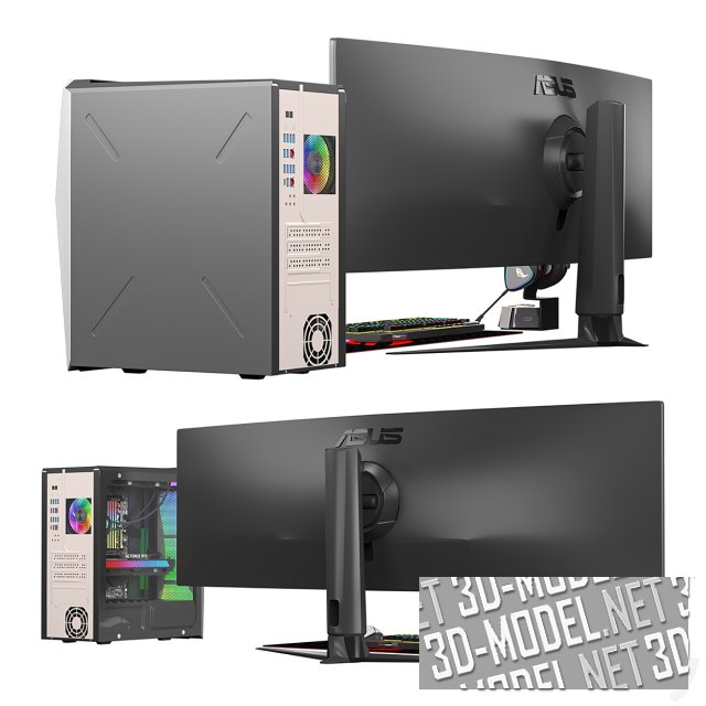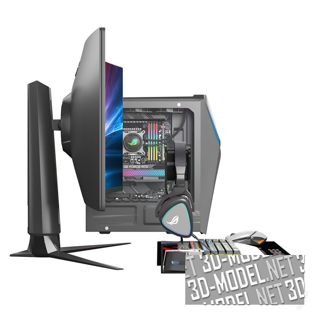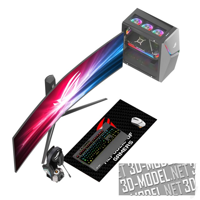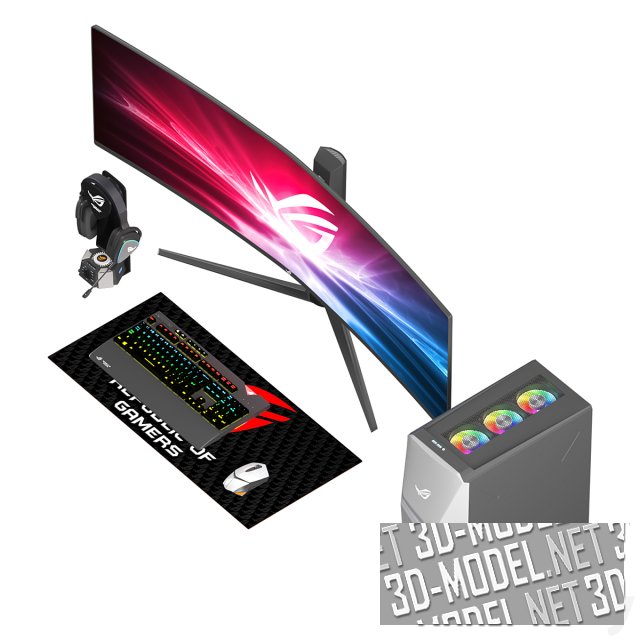 Набор компьютерной техники ASUS, в который входит: изогнутый монитор, системный блок, клавиатура, беспроводная мышка, черный коврик с ярким принтом и наушники.