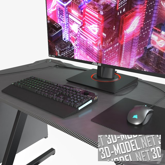 Современный набор из компьютера (корпус системного блока Corsair Obsidian 750D), периферии (проводные наушники ASUS ROG Delta Core, мышь Coresair saber rgb pro, коврик, клавиатура TUF GAMING K1, монитор Asus Vg278q) и компьютерного стола Homall со столешницей из карбона и красными элементами на ножках. На кромке стола закреплена сетчатая металлическая подставка со стаканчиком для напитков. Корпуса черные.