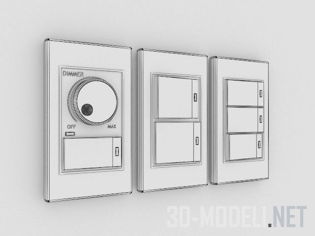 Три вида клавишных выключателей белого цвета, для современного интерьера. Один из выключателей оснащен диммером.