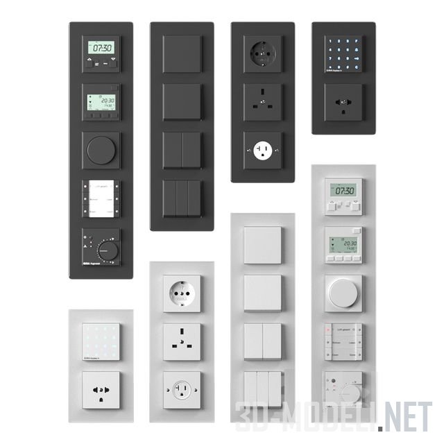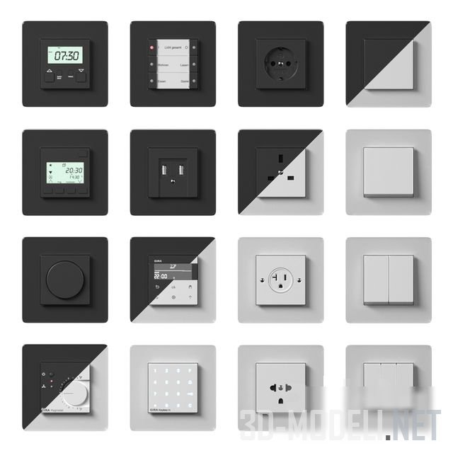 Комплект выключателей, розеток и электроники от бренда Gira, серия System 55 для стеклянных рам серий Esprit Glas и Esprit Glas C. В наборе следующие позиции: