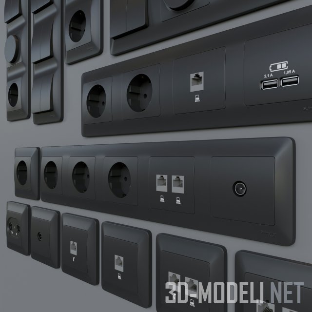 Современные розетки и выключатели графитового цвета серии Glossa от французского производителя Schneider Electric. В сцене представлены:
