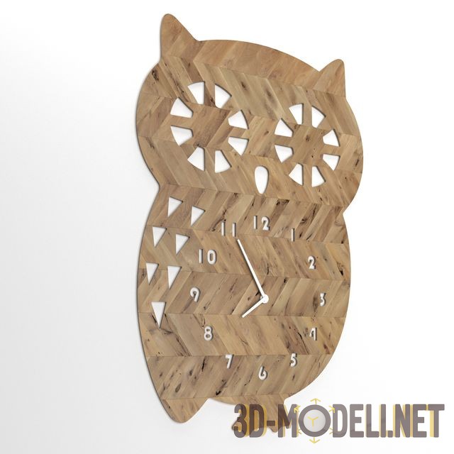 Настенные часы в виде фигурки совы, вырезанной из тонкой, фигурно–шпонированной плиты. В силуэте прорезано несколько геометрических отверстий, соединяющихся в изображение глаз совы, клюв, элементов крыла и циферблат часов. Стрелки часов небольшие, белые. Часы могут украсить интерьер современной детской комнаты.