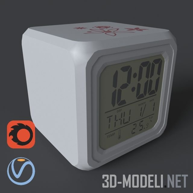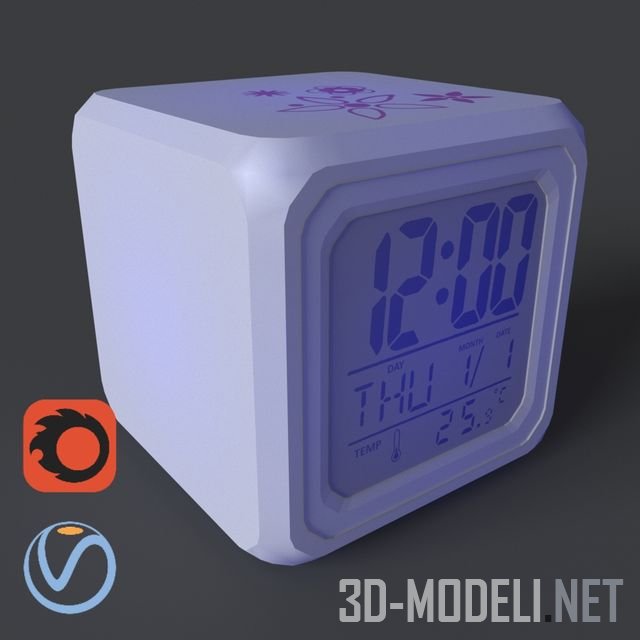 Небольшие электронные часы с подсветкой, в корпусе из белого пластика, выполненного в виде кубика. На белом кубике грани и углы срезаны. На верхнюю плоскость корпуса нанесены цветы. На фронтальной плоскости – индикация времени, календарь, температура воздуха. Подсветка настраивается через источник света в сцене.