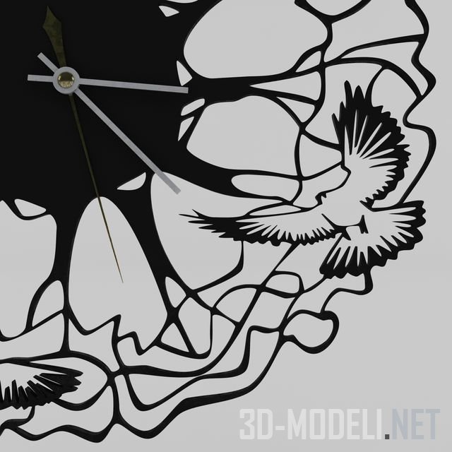 Дизайнерские часы «Древо» от производителя Ярмарка Мастеров. Изготовлены часы в виде круга из веток черного цвета, на которых сидят птицы. Диаметр 35 см.