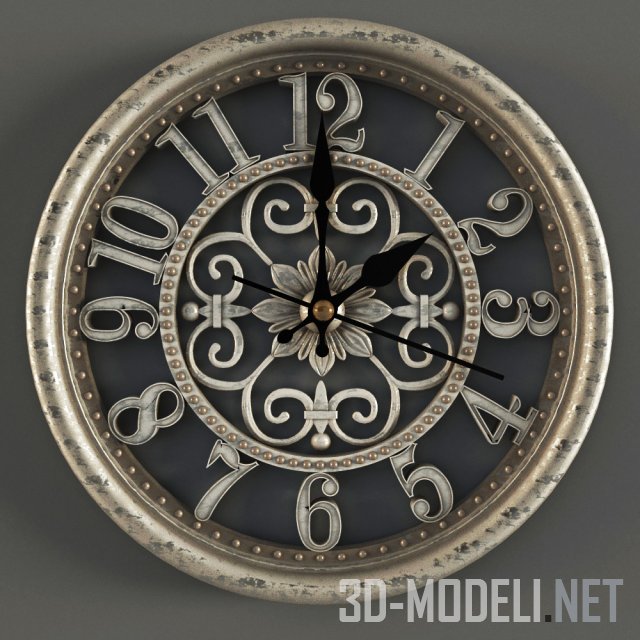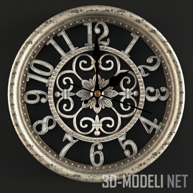 Круглые настенные часы с «прорезанным» фоном на циферблате. Кромка циферблата изготовлена в виде резного багета. Объемные цифры, расположившиеся по кругу и резная розетка с ковано-растительным мотивом в центре, а также рамка декорированы «античным золотом», паталью и патиной. Стрелки часов черные, с крупными «пиками» на концах.