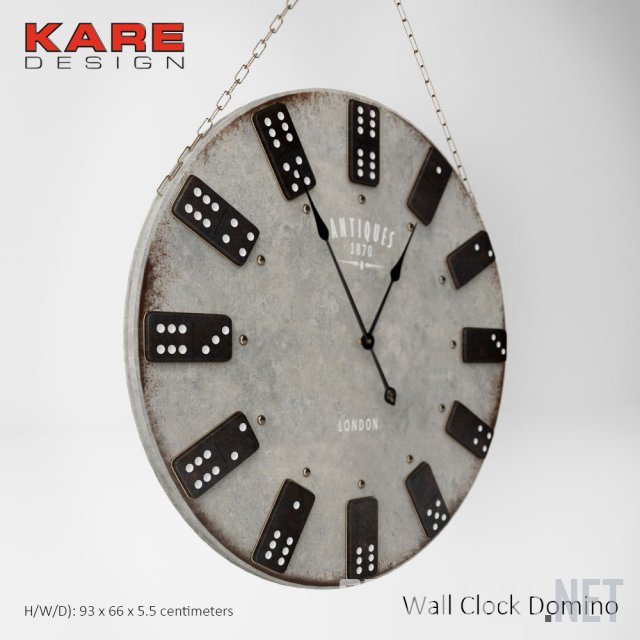 Настенные круглые часы Domino от Kare design, с костяшками домино вместо цифр. Циферблат подвешен на цепочку. На циферблате - белые надписи: «Antiques, 1870», «LONDON». Габарит часов: 93 х 66 х 5,5 см.