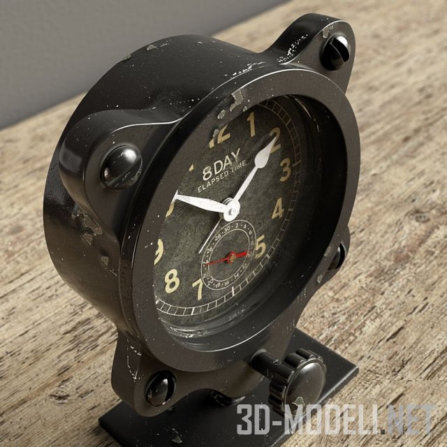 Настольные часы WWII 8 Day Clock вдохновлены настоящими авиационными часами 1940-х годов времен Второй мировой войны. Это копия от Restoration Hardware, увеличенная в три раза по сравнению с оригиналом, точно повторяет каждую деталь оригинальных часов. Модель с четырьмя крепежными винтами, светящимися стрелками и цифрами. а также большой ручкой внизу для завода и установки времени. Нижний циферблат носит декоративную функцию.