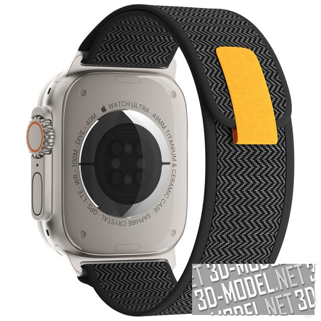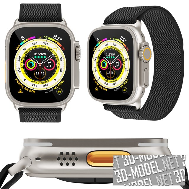 Современные смарт-часы от Apple. Модель - Apple Watch Ultra. Облегченный корпус из серебристо-матового титана с лаконичными элементами золотисто-оранжевого цвета. Ремешок из тонкого нейлонового плетения декорирован зигзагами черного и серого цвета. На мониторе часов - яркий циферблат с множеством дополнительной информации.