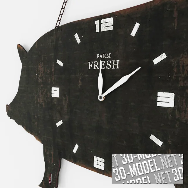 Рустикальные настенные часы Farm Fresh от KARE. Сделаны в виде черного, с ржавыми потертостями, силуэта свиньи, висящего на темной металлической цепочке. Белые цифры и метки скомпонованы в круглый циферблат на боку. Габарит: 69,8х67х4см.