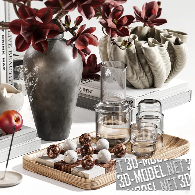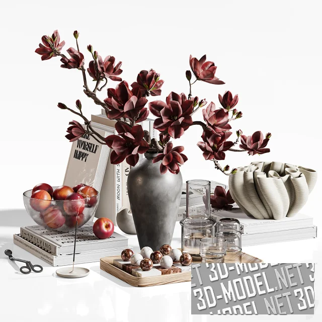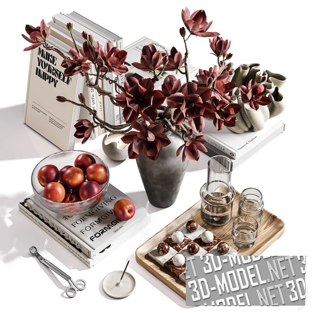 Эффектная интерьерная композиция для наполнения стола, тумбы или полок. В декоративный набор входят стилизованные книги с нейтральными современными обложками, стеклянная миска со сливами, скульптурная керамическая ваза, стеклянная посуда и поднос для десертов, букет с магнолией бордового цвета в серой вазе. Минималистичная подставка для благовоний с горящей палочкой, ножницами и свечой в бетонном подсвечнике усиливают реалистичность композиции.