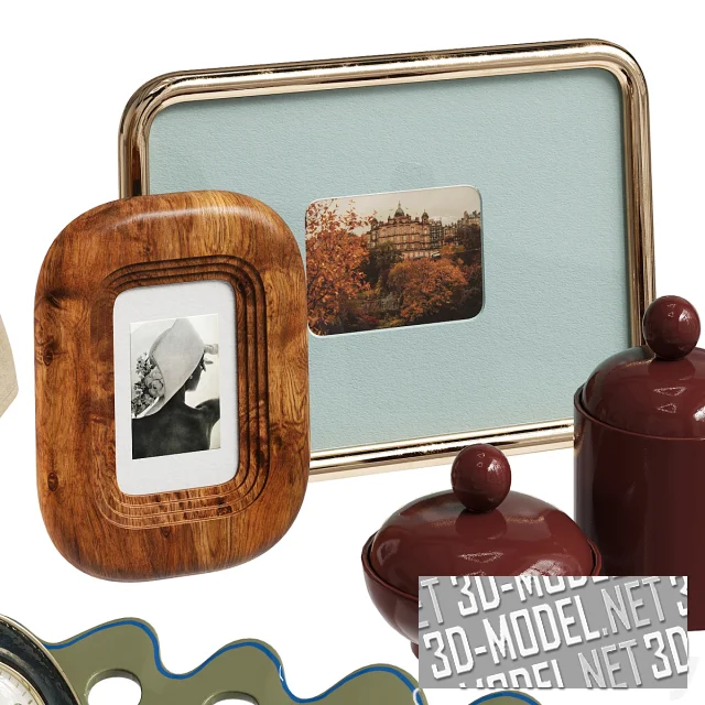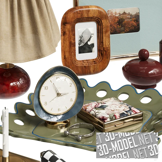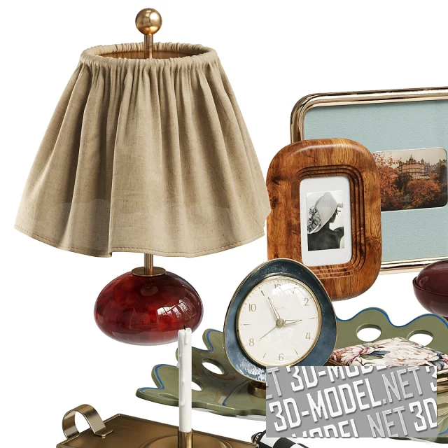 Все предметы выглядят так, словно их собирали постепенно – одни привезены из путешествий, другие нашли место на консоли в спальне, третьи идеально подошли бы к уютной дневной зоне. Каждый объект выполняет роль маленького акцента, создающего атмосферу тепла, истории и домашнего уюта. Такой набор можно использовать в интерьерной визуализации, в стилизации помещений, в предметной съемке или для оформления витрин.