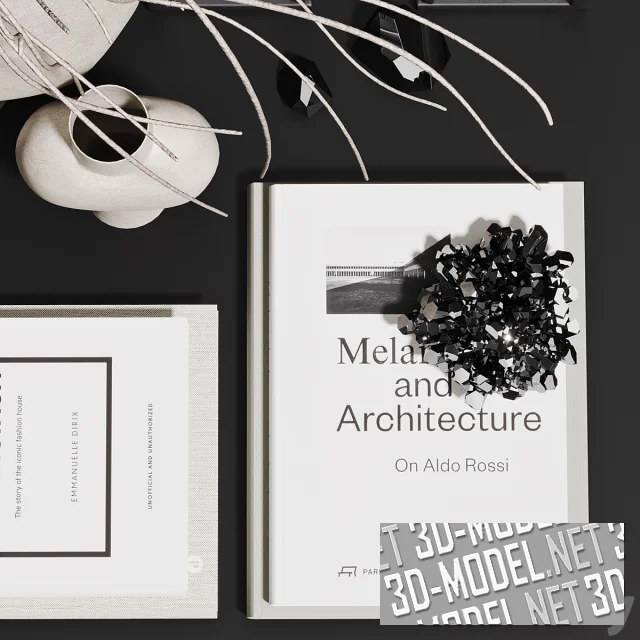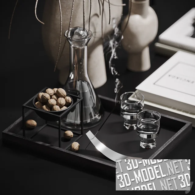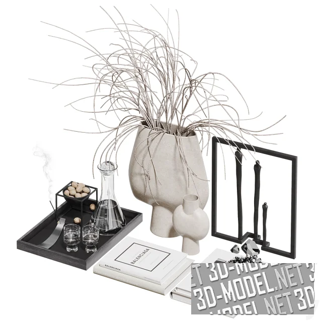 Тщательно продуманная композиция, собранная из декоративных предметов для современной гостиной или кабинета. Центральное место занимает крупная ваза скульптурной формы с матовой бежевой поверхностью и длинными изогнутыми ветвями, создающими ощущение динамики и легкого хаоса. Рядом расположена небольшая ваза округлой формы, которая уравновешивает объем основной. Поднос с прозрачными стеклянными бутылками графитового оттенка, металлической чашей с орехами и дымящимся ароматическим элементом создает атмосферу расслабленного уюта. Завершает композицию стопка дизайнерских книг, металлическая рама с декоративными свечами и небольшая скульптурная группа. Общие размеры набора (105 x 85 x 73 см) позволяют использовать его как выразительный акцент на консольном столике, комоде или журнальном столе.