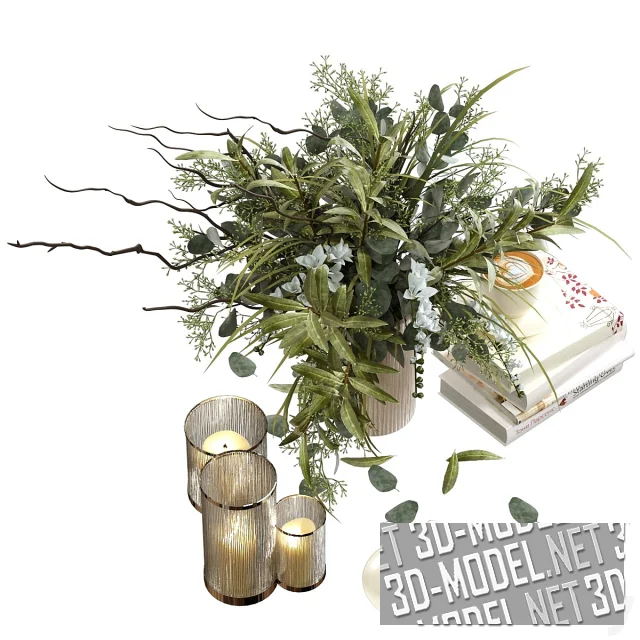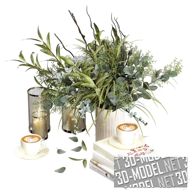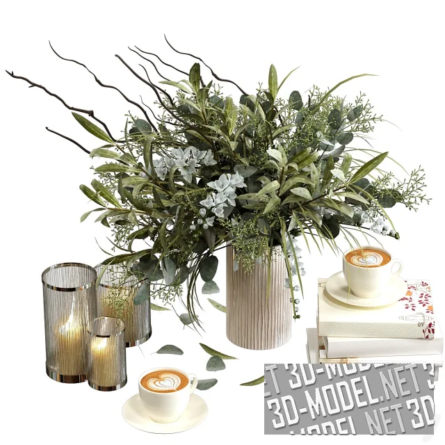 Набор интерьерных декоративных элементов в элегантной композиции с рельефной бежевой керамической вазой и большим букетом. Букет собран из веток эвкалипта, оливы, тонколистных злаковых трав и белых цветов. Волнистые сухие ветки выступают в букете контрастным акцентом. Три стеклянных мелкогофрированных сосуда с металлическими окантовками кромок служат светильниками для свечей. Пара белых чашек с капучино украшены пенкой в виде сердца и стоят на белых блюдцах. Небольшая стопка книг дополняет композицию.