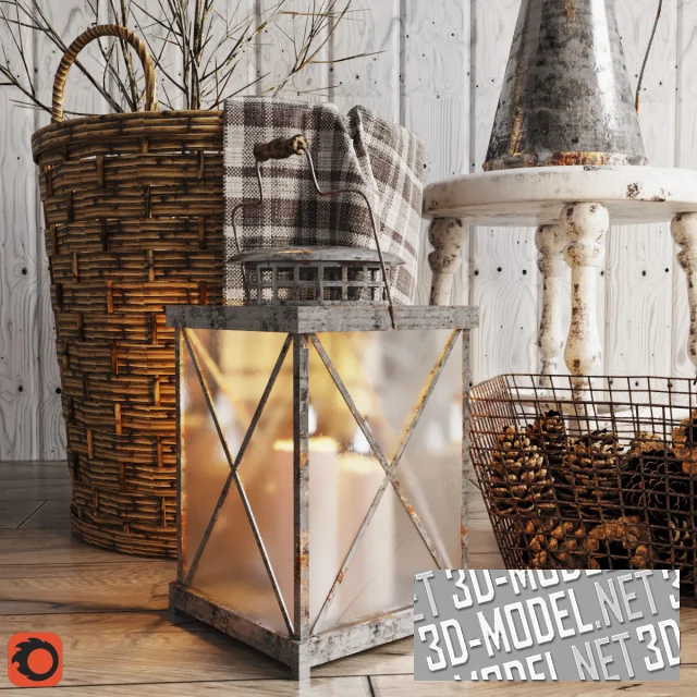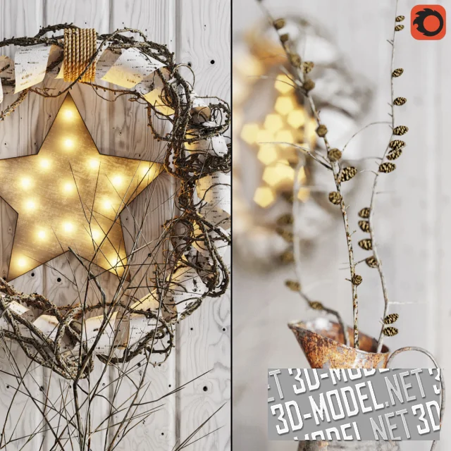 В декоре преобладают природные, натуральные элементы, такие как дерево (дощатая стена, деревянная табуретка, плетеная корзина), металлические изделия (кувшин, фонари, корзина из проволоки) и природные украшения (шишки, сухие ветки, венок из лозы). Используются свечи в фонарях и гирлянда с подсветкой в виде звезды, что создает теплую, уютную атмосферу, характерную для зимнего и рождественского декора.