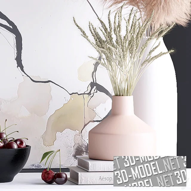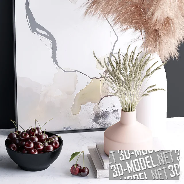 Небольшая настольная композиция, в которой мягкие природные мотивы сочетаются с графичным фоном. На мраморной столешнице стоит матовая розовая ваза с сухими злаками и пышными метелками трав, рядом высокая белая форма-объект и минималистичная абстрактная картина в тонкой раме. Композицию дополняют пара аккуратно уложенных светлых книг и глубокая черная миска, наполненная спелой черешней.